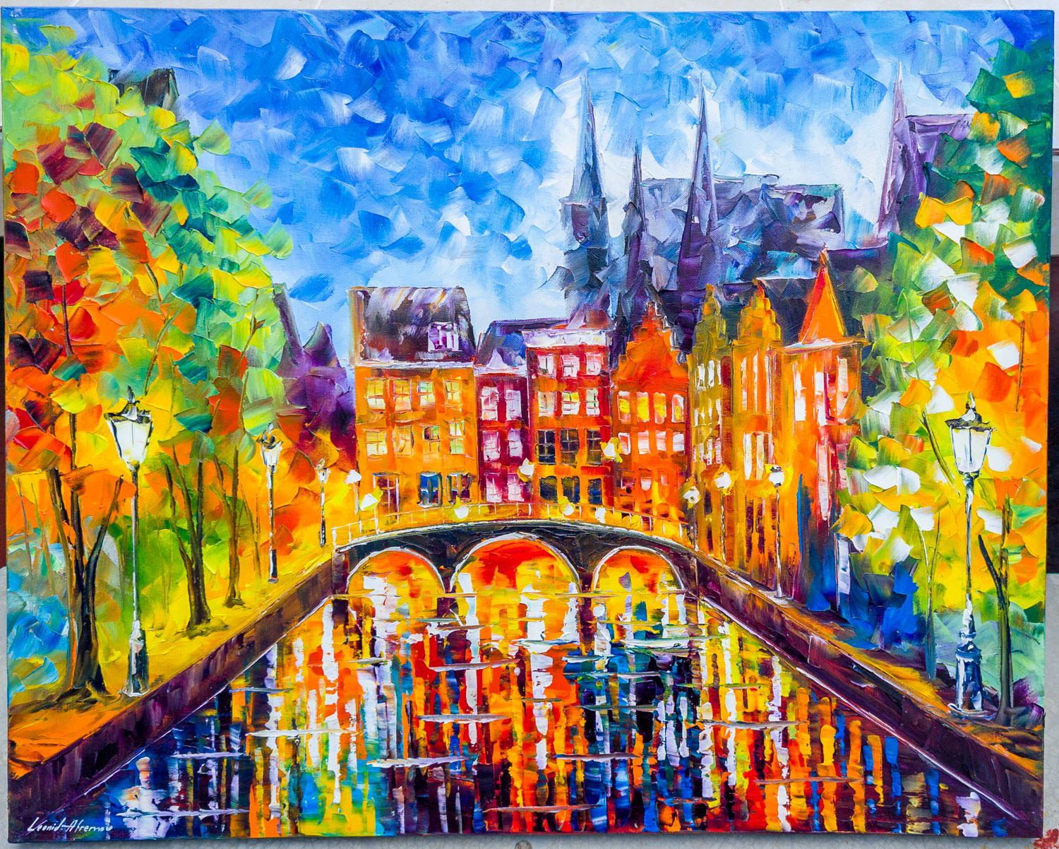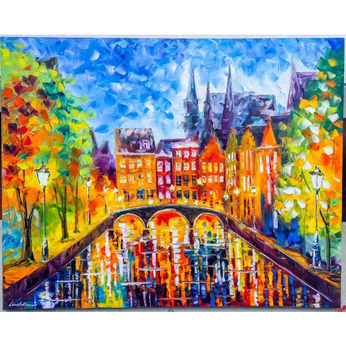 This AMSTERDAM CANAL panting is the last one available from the limited edition, it is 10th out of 10 paintings. The photos you see for this listing are actual photos taken with a phone of the painting you will receive.