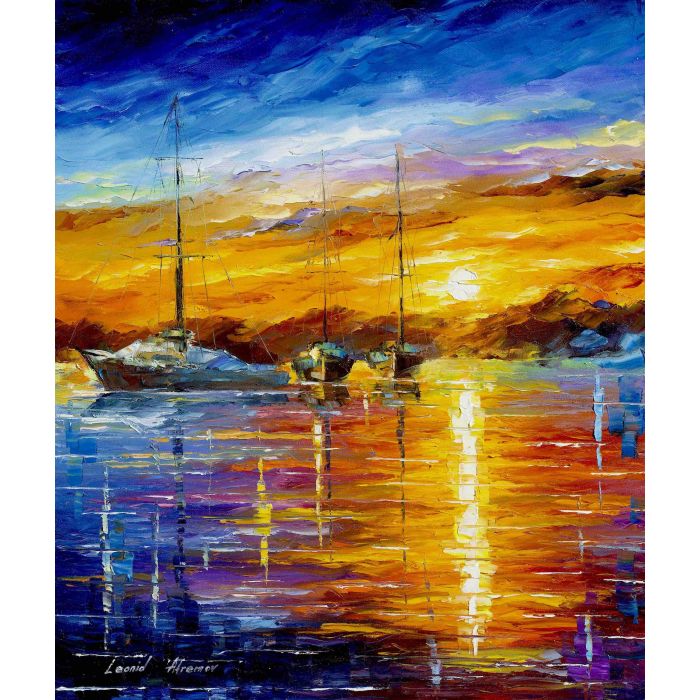I would like to present my hand painted oil on canvas painting (recreation) of the artwork BOATS SUNRISE AND HAPPINES . I made this piece with the same amount of soul and emotion just like the first original painting. This piece is created with oil paint on artistic canvas using my unique technique of a palette knife. The artwork has texture, you can feel the strokes by touching the painting. By purchasing on this site, you are buying directly from the artist Leonid Afremov. I guarantee your satisfaction and the best customer experience.