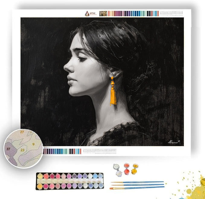 CHARCOAL PORTRAIT WITH SAFFRON EARRING B&W - Paint by Numbers Full Kit