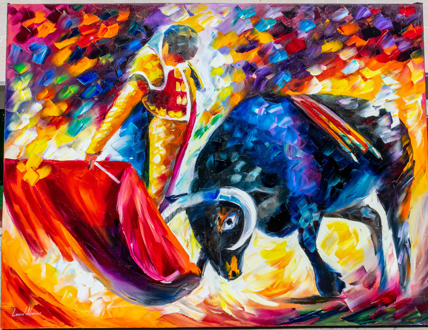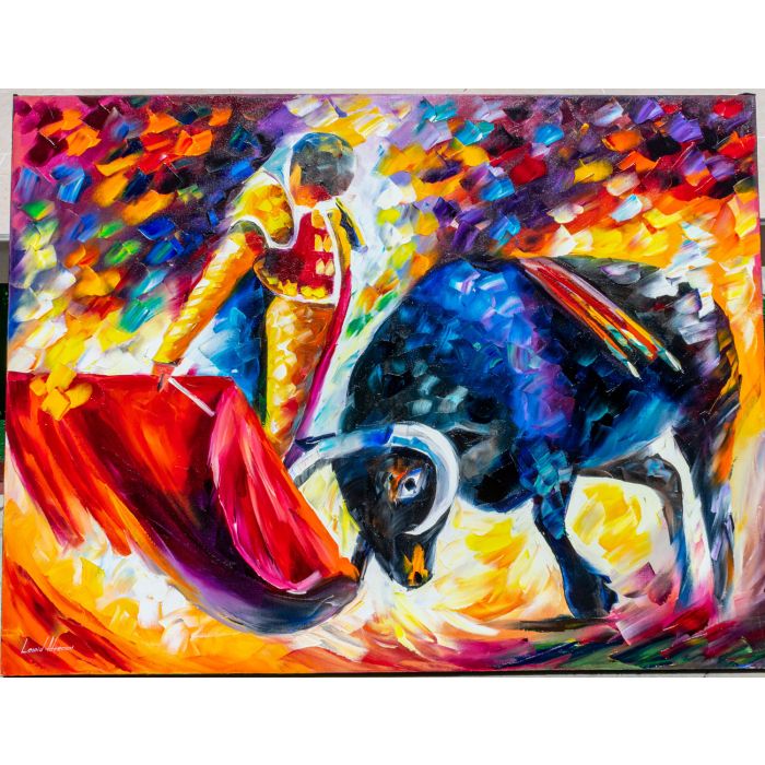 This CORRIDA WITH DANGEROUS OPPONENT panting is the last one available from the limited edition, it is 10th out of 10 paintings. The photos you see for this listing are actual photos taken with a phone of the painting you will receive.