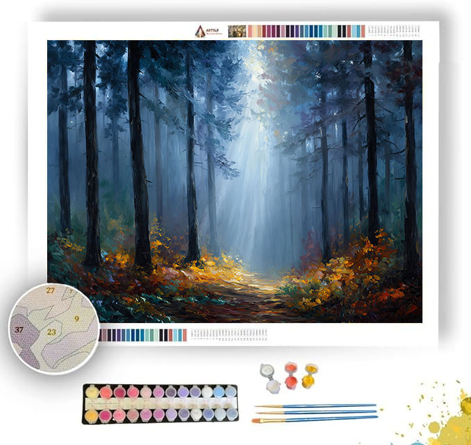 Whether pursued for personal artistic expression or given as a thoughtful gift, this kit invites individuals to bask in the radiant world of sunflowers, allowing them to infuse Afremov Gallery artist's creation with vivid colors and meticulous attention to detail, bringing the FOGGY WOODS to life in their own unique interpretation.