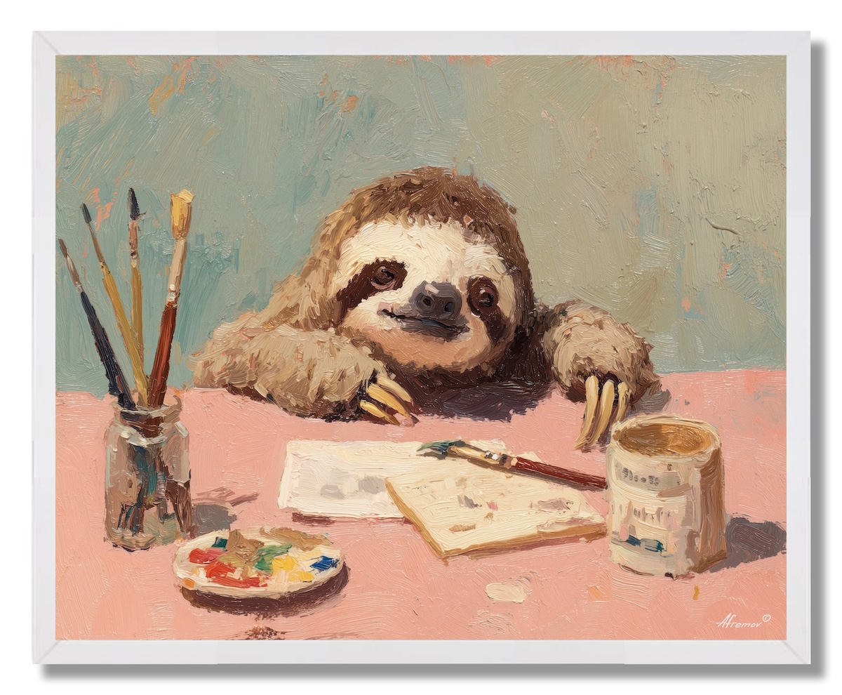 KAWAII SLOTH WORKING AT DESK - FRAMED
