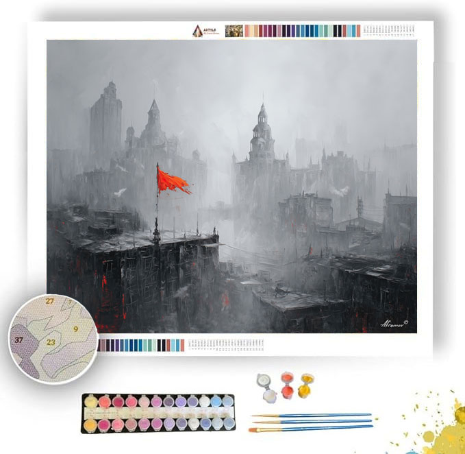 UMBER CITY WITH VERMILION DRIFT B&W - Paint by Numbers Full Kit
