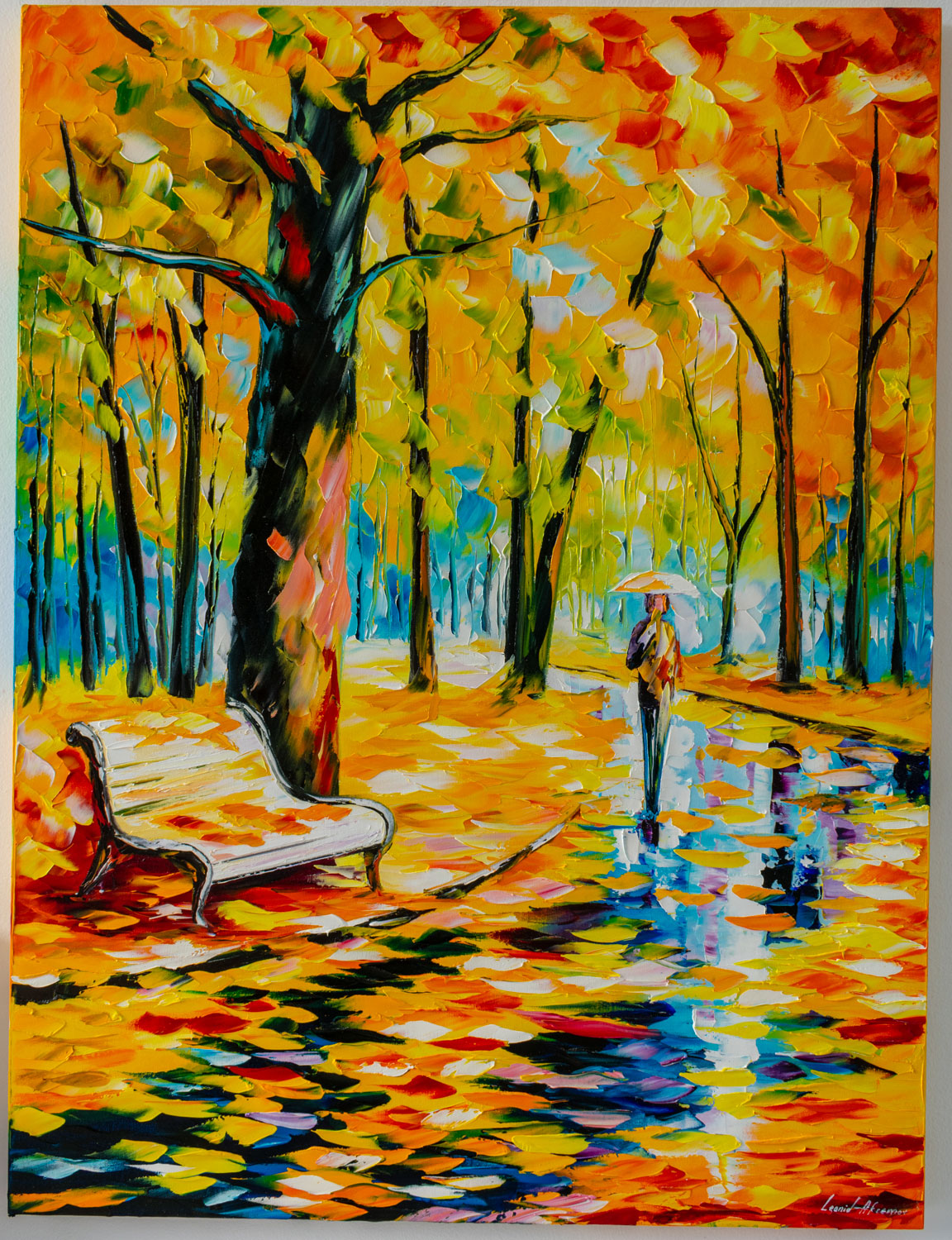 This FALL RAIN IN PARK panting is the last one available from the limited edition, it is 10th out of 10 paintings. The photos you see for this listing are actual photos taken with a phone of the painting you will receive.