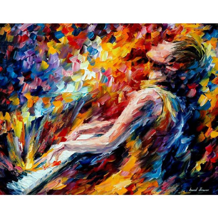 Music is an important part of life of every human. We hear it in movies, plays, it sets our mood in bars and clubs. People who know how to perform or create music are still worshipped like gods in our society. Many works of art created by Leonid Afremov in the technique of oil painting represent musicians and the process of creating music. The famous artist was inspired be a passionate musician when creating this fascinating canvas as well.