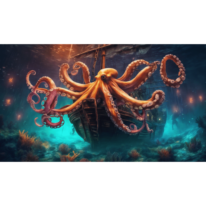 OCTOPUS OVER A SUNKEN PIRATE SHIP - stretched and ready to hang giclee on canvas