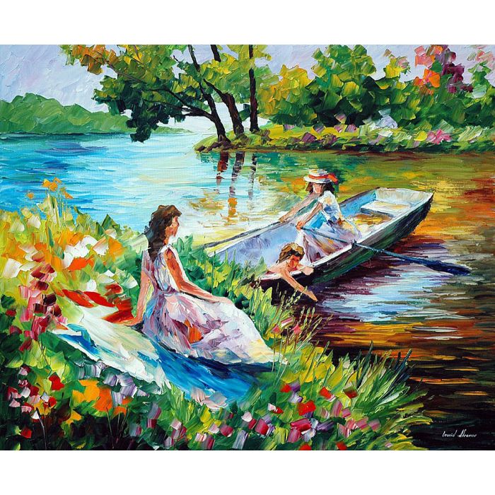 On this artwork by Leonid Afremov we can see a group of children with their nanny or elder sister in the open air. It is a magnificent summer morning near the river. The grass is green and fresh, the water is calm and transparent, and the trees are whispering their secrets to the wind.