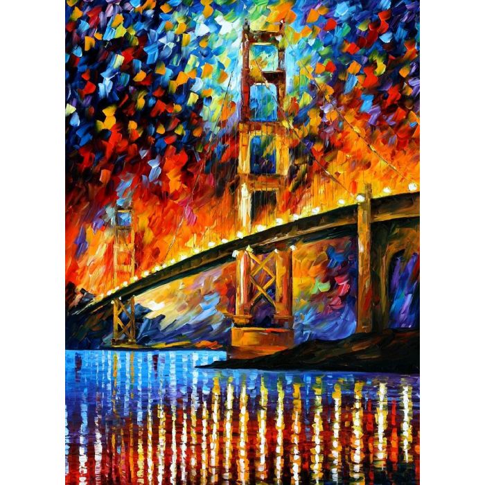 Leonid Afremov is a contemporary artist who gets inspiration from nature and urban landscapes. He traveled a lot in his life, and each of these trips inspired one or two of his artworks. His favorite subject to paint is a night city during a rainy night. He likes to add light to the scenery painting lanterns and other sources of light. When Leonid Afremov first arrived to San Francisco, he was stunned by the beauty of the Golden Gate; it inspired a canvas that today can be called a true work of art.