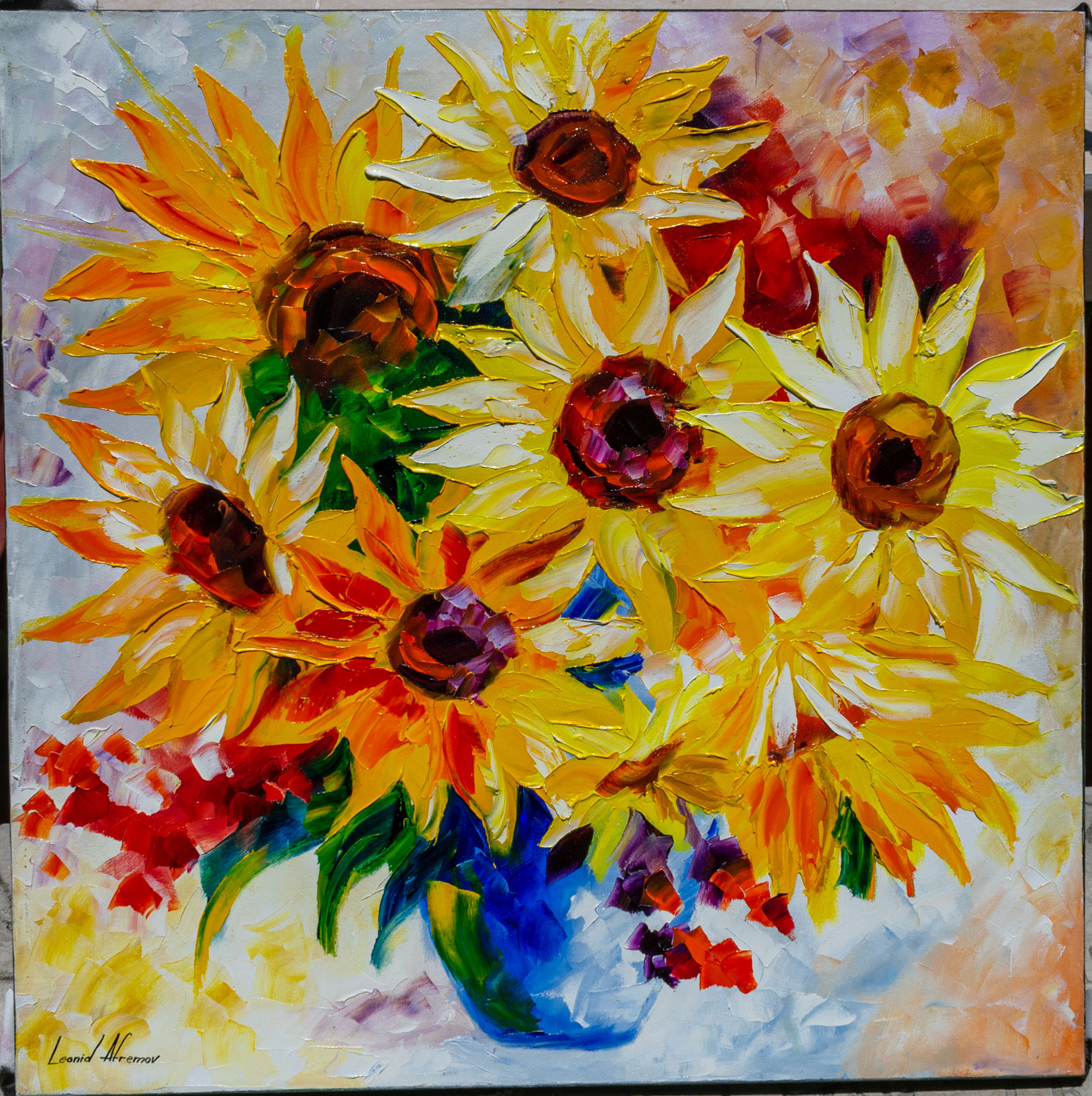 This SUN FLOWERS panting is the last one available from the limited edition, it is 10th out of 10 paintings. The photos you see for this listing are actual photos taken with a phone of the painting you will receive.