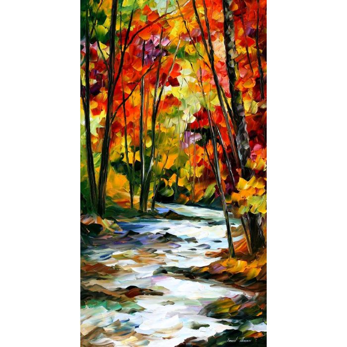 Nature presents our eyes amazing pictures and the task of the artist is to look at them and paint them with all the real and imaginary colors that Leonid Afremov did in his Swirling Stream painting - here he depicted an autumn forest and the brook running along it. Swirly streams fueled by autumn rains come down from picturesque mountains decorating one of the most beautiful paintings created by the artist. They giggle happily invariably bringing some kind of animation into the forest, filling it with a new life. Here you can notice a certain contrasting of life - it's fresh water rushing from the mountains - and wilting - the slowly fading colors of the autumn leaves. They by the way simply amaze our eyes. Here we see almost all the shades that autumn gives us – red, orange, yellow, all the shades of green - there are so many of them that the human eye cannot distinguish them all, and all the more to give everyone a name.