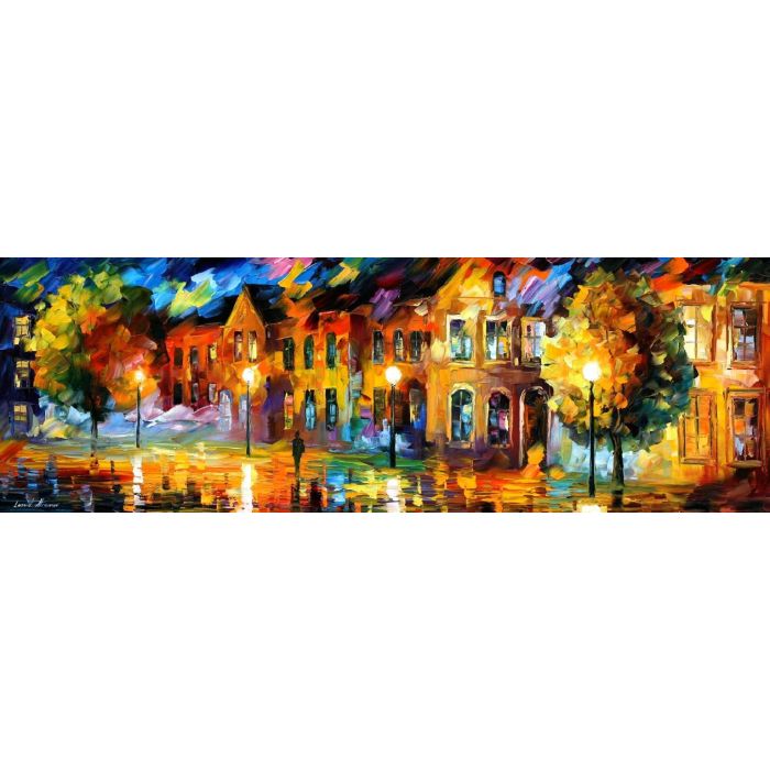 Urban life has many faces, and you can spend your whole life trying to divide them. In this painting, Leonid Afremov depicts the utter beauty of one night in a city. You can’t see skyscrapers here, only nice small houses that are standing in the street, closely set together. It’s up to the viewer to decide whether it is a tiny village or suburbs of a giant megalopolis. In the middle of the street there is a man crossing the road. He seems to be lonely, lost in the street lamp lights. This stranger isn’t the only one basking in them – they can fill your heart with warmth as well. Bright colors of the sleeping houses are reflected in the road puddles making the picture very distinct and lively. Looking at this canvas makes you feel part of this night street. Night is no longer associated with darkness and dim silhouettes, now it is colorful and mysterious.