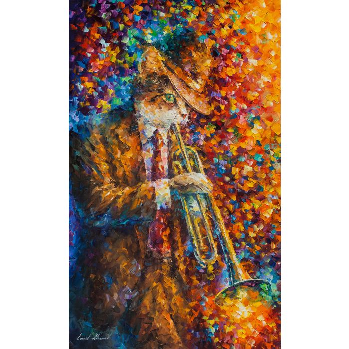 On the jazz paintings of Leonid Afremov you can find cats playing different musical instruments. This painting shows a cat playing a trumpet. As always, the background of the painting is made in the form of multi-colored brush strokes that fill the entire canvas. We find this feature in one more element of the painting – the cat musician extracts the whole flow of such strokes from his trumpet. In the painting dominate orange, brown and turquoise colors. At first glance, it’s a rather strange combination. But not for Leonid Afremov's paintings! Here you can find even more exotic colors. And all of them are surprisingly well in tune with each other. The brightest yellow colors are concentrated at the trumpet. It seems that the instrument is so hot that flames fly out of it.