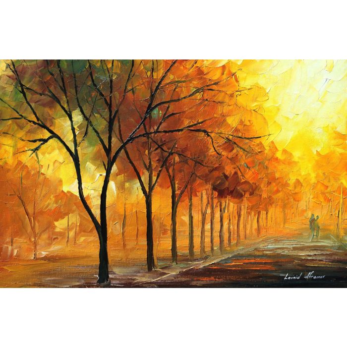 There are also a few fragments of muddy green here and there to create contrast albeit not too stark. Altogether, the view looks very refined, charming and even magical. Everything on the canvas seems to be made of light – that of the last sunbeams, that of the last leaves and that of the artist’s vision. With a couple of dainty palette knife strokes, Leonid Afremov showed us a moment of fleeting beauty and stopped the time so that we could enjoy it too. This marvelous autumn day can last as long as you like – just hang the canvas on your wall and return here to relive it again and again!